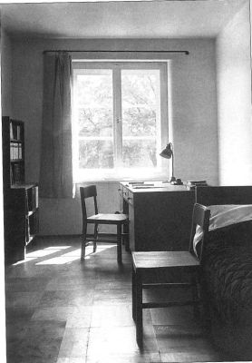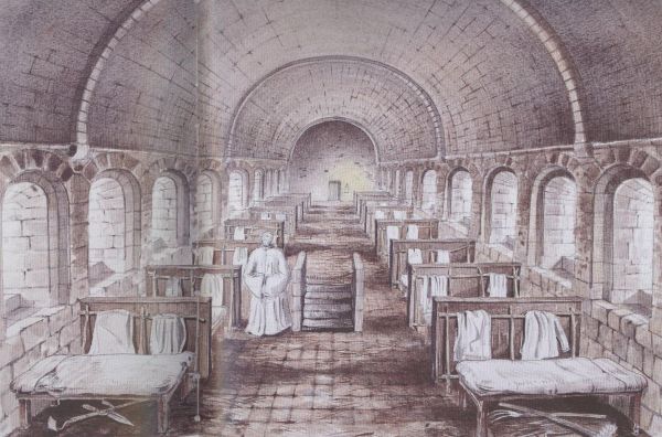V patře nad východním křídlem konventu byl v klášterech zpravidla umístěn dormitář mnichů. Ve středověku šlo o společnou ložnici, obvykle velkou obdélnou místnost s množstvím lůžek. Jednotlivá lože byla velmi jednoduchá, snad jen pryčna a slamník. Mniši spali oblečeni ve svém denním hábitu, na přikrytí jim sloužila deka. Postele bylo možné oddělit textilním závěsem. Takovéto členění však mnichům mnoho soukromí neposkytovalo.
